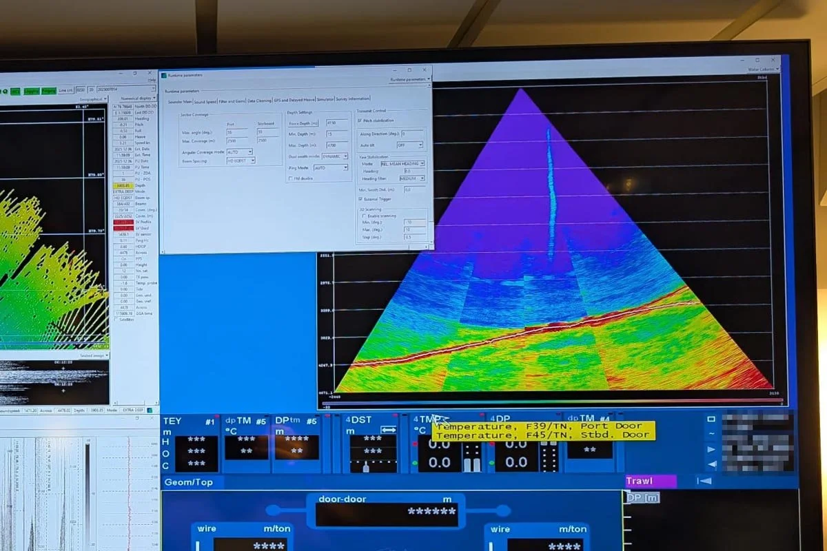 Stemningen stiger i instrumentrommet på Kronprins Haakon, der mesteparten av ekspedisjonens vitenskapelige data blir samlet inn, idet søylen vises tydelig på skipets multistråle-ekkolodd.