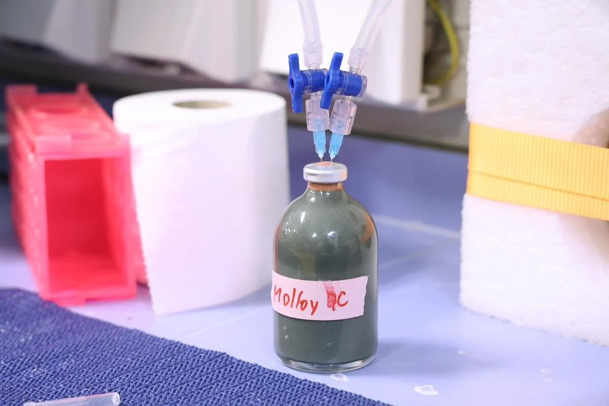 Når flasken med sediment og vann er klar, kobles den inn i et enkelt, men effektivt system av rør og saltlake. Poenget er å presse gassen ut av sedimentblandingen og inn i en egen beholder, uten at noe slipper ut underveis.