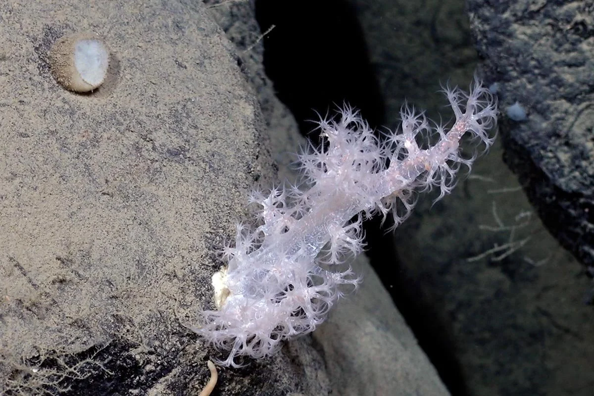 Nærbilde av en mykkorall, en langsomtvoksende organisme som skaper viktige mikrohabitater på dypet i Arktis (denne lå på ca 1700 meters vanndyp).
