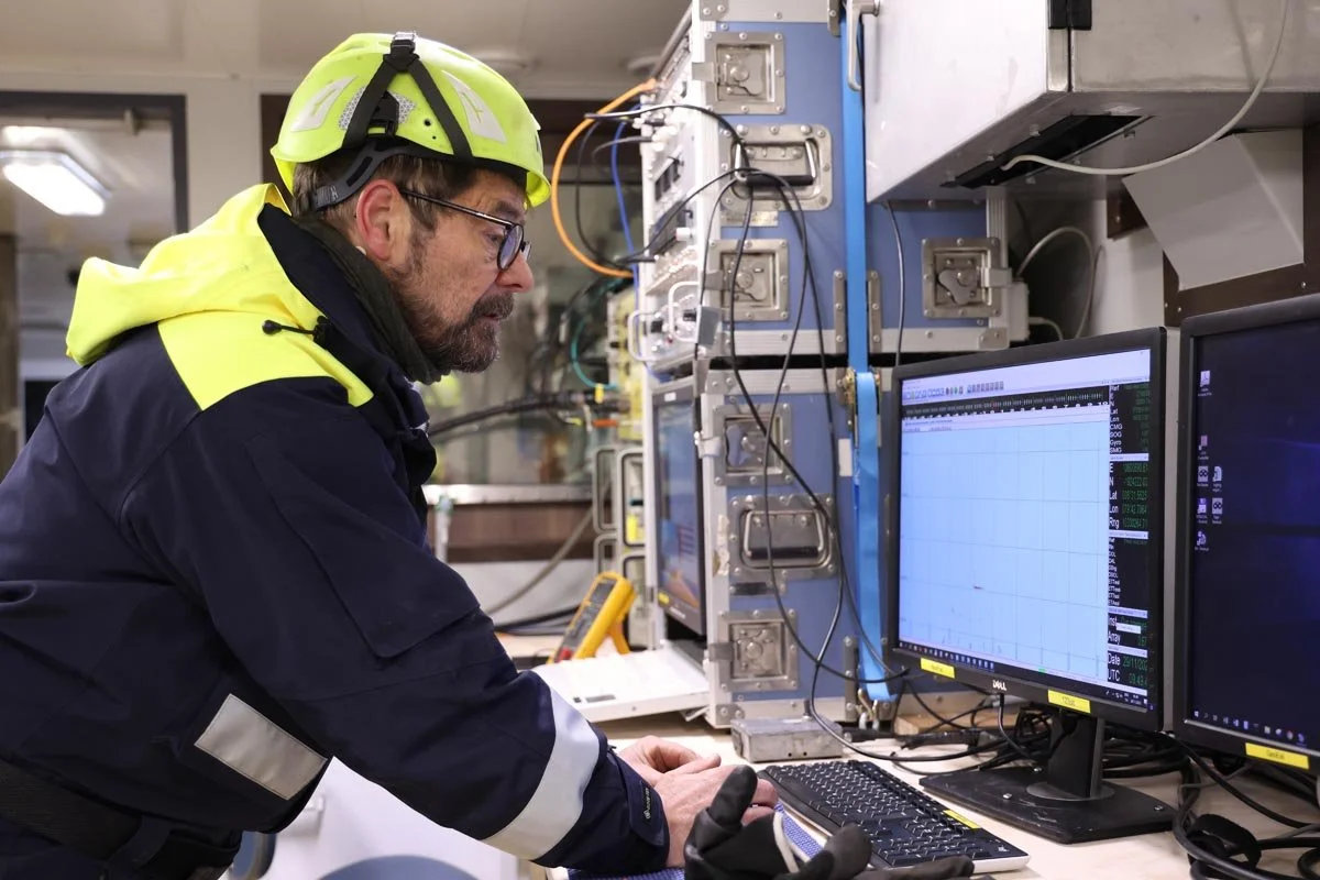 Ombord på Kronprins Haakon bruker seismikkteamet de første dagene til å sørge for at alt utstyret fungerer slik det skal. I dag sto skipets egen kompressor for tur. Seismiske undersøkelser skjer som følge: ved å sende kraftige trykkbølger ned i havbunnen (generert av en luftkanon) kan forskerne “se” lagene som skjuler seg under sedimentene. For å levere disse luftstøtene trengs en kompressor, og heldigvis er fartøyet godt utstyrt.
