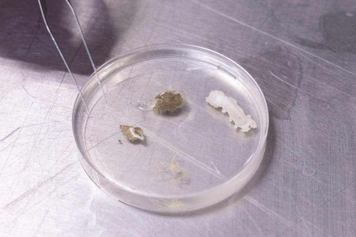 Thomas Dahlgren (NORCE) viser fram dyrene han samlet inn, i en petriskål.