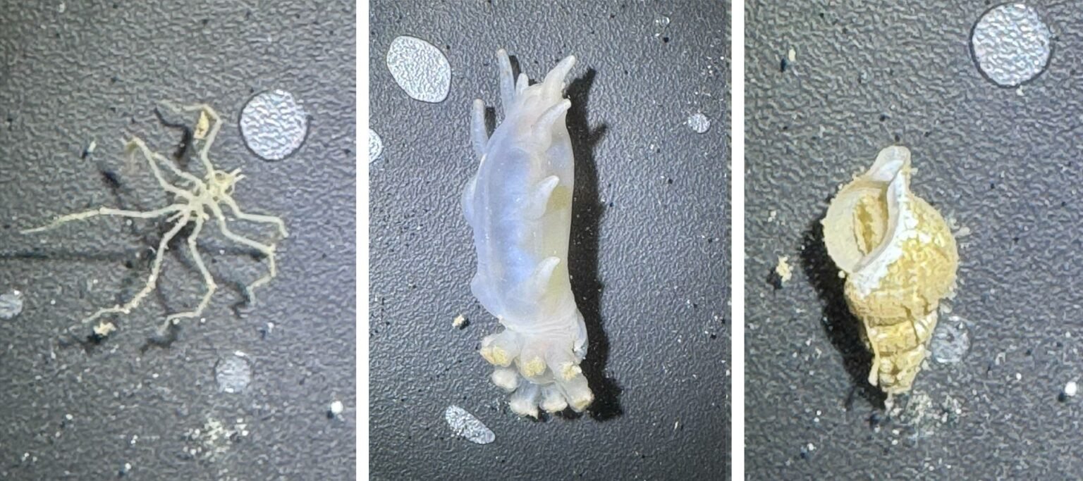 Til venstre ligger en pycnogonid – bedre kjent som en sjøedderkopp. Hvilken art det er snakk om, er vanskelig å si. Ifølge Thomas finnes det bare en håndfull eksperter i verden som trygt kan artsbestemme dem. I midten ser vi sjøpølsen Kolga hyalina, en vanlig art i disse farvannene. Til høyre ligger en snegldyrart. Til sammenligning var sjøedderkoppen og sneglen omtrent 1 cm lange, mens sjøpølsen målte like under 2 cm. Foto: Thomas Dahlgren /NORCE
