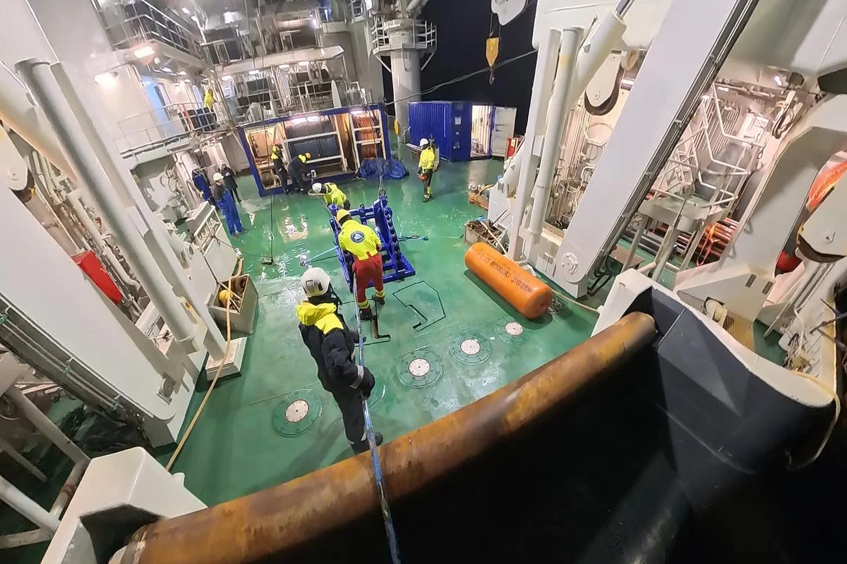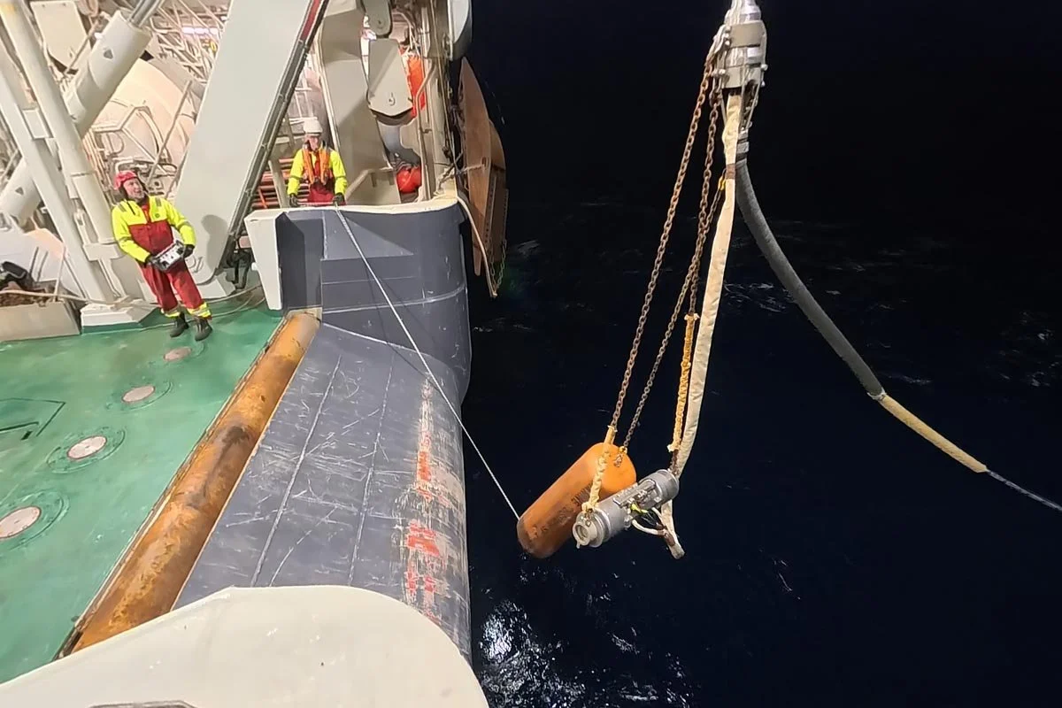 Skipet holder svært lav fart mens streameren rulles ut akterut.