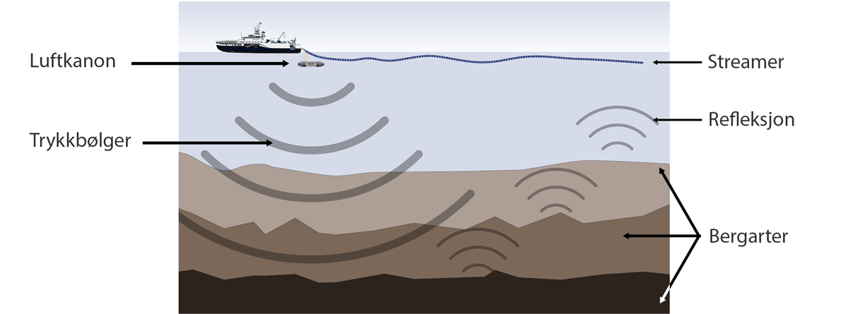 Denne illustrasjonen viser hvordan luftkanonen sender ut trykkbølger som reflekteres fra ulike lag i havbunnen og deretter fanges opp av sensorene på streameren. Illustrasjon: Daniel Albert, GoNorth/SINTEF