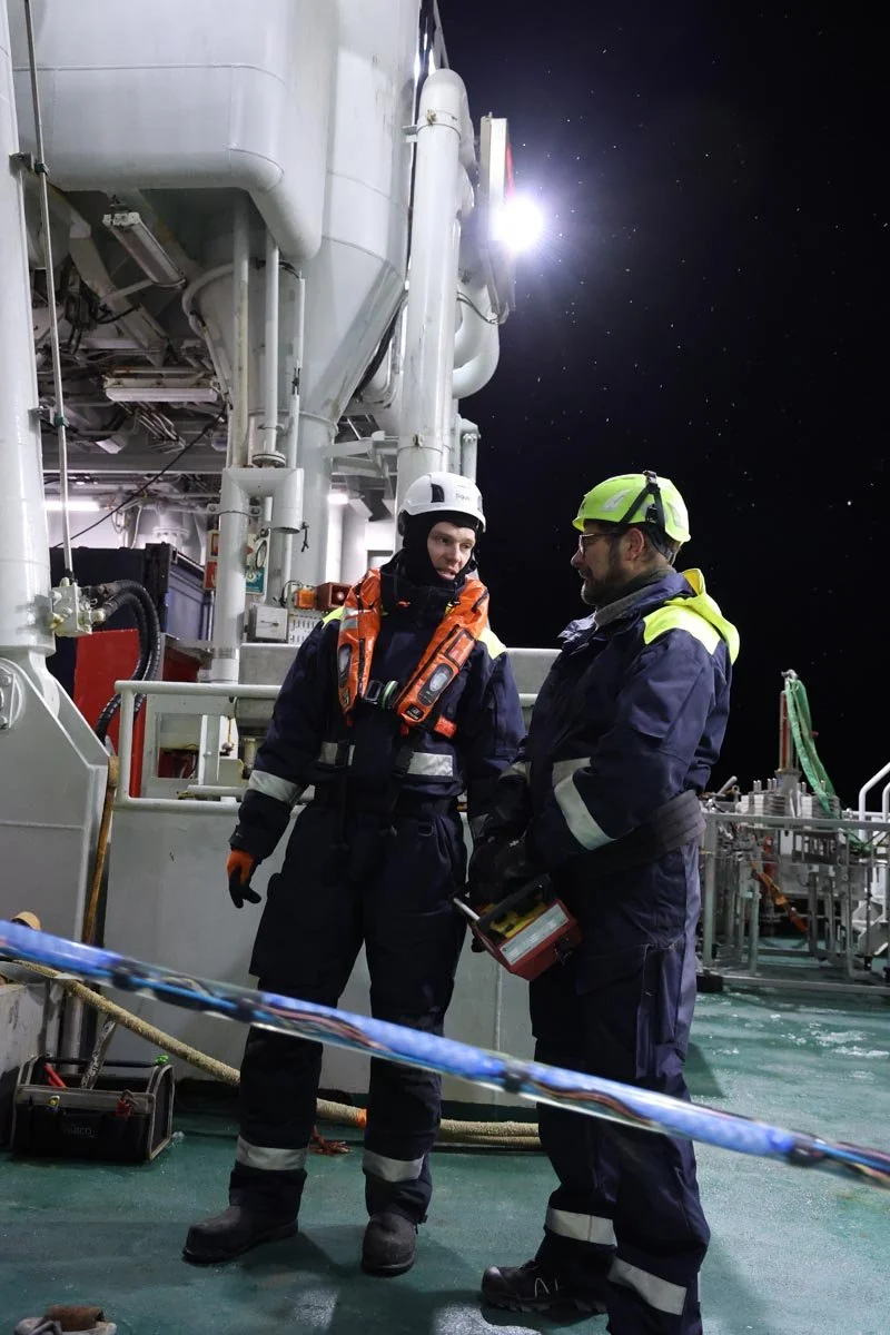 Mens streameren spoles inn om bord (i forgrunnen), diskuterer Sigurd B. Andersen (GEUS) og Per Trinhammer (Aarhus Universitet) de neste stegene i opptaksoperasjonen.