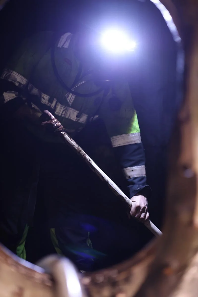 Benjamin Farstad Knotten (HI) i arbeid for å rengjøre innsiden av et av Kronprins Haakons fire dieseltanker.