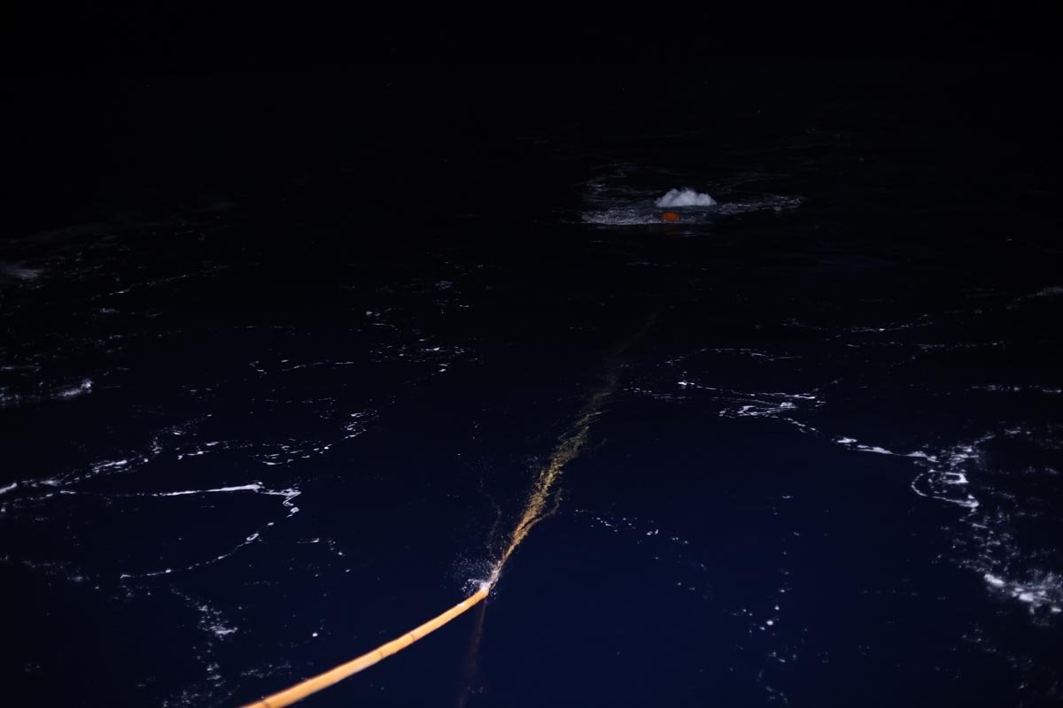 Boblen fra luftkanon-skuddet kan ses bryte overflaten ved siden av den oransje bøya, som hjelper til med å holde kanonen i riktig posisjon.