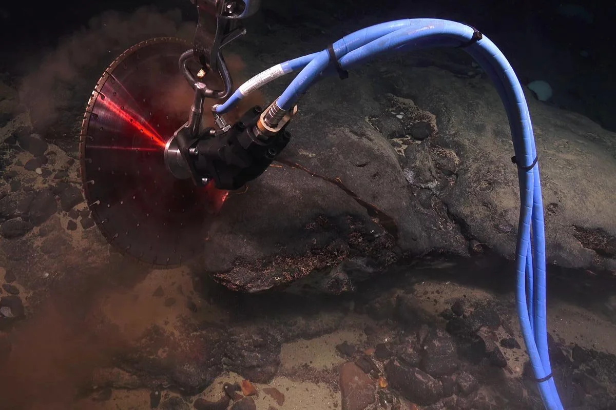 ROV-en brukte nærmere en time på å sage ut en bergartsprøve med denne sirkelsagen. For geologer som forsøker å avdekke en regions historie er det avgjørende å få tak i prøver som er in situ – altså stein som ligger der den hører hjemme, i motsetning til blokkene som kan ha blitt fraktet og droppet av et smeltende isfjell. Foto: Ægir 6000/NORMAR