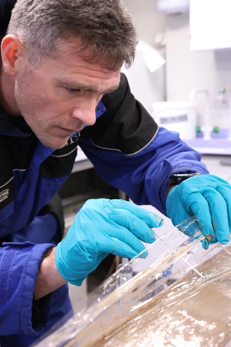Deretter deles kjernen opp i seksjoner og merkes nøye, slik at informasjonen om hvor hvert segment kommer fra ikke går tapt. På bildet: Dag Inge Blindheim (NORCE).