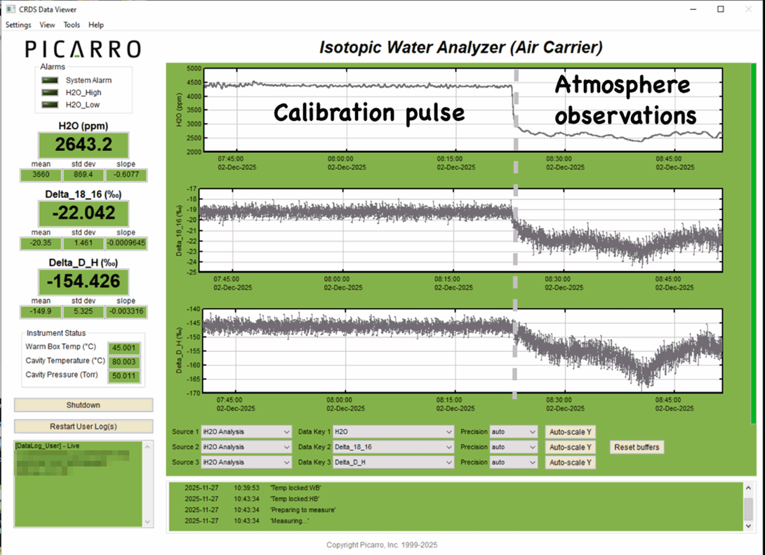 Målinger i sanntid som viser kalibrering og atmosfæriske målinger av vanndampens isotopsammensetning.