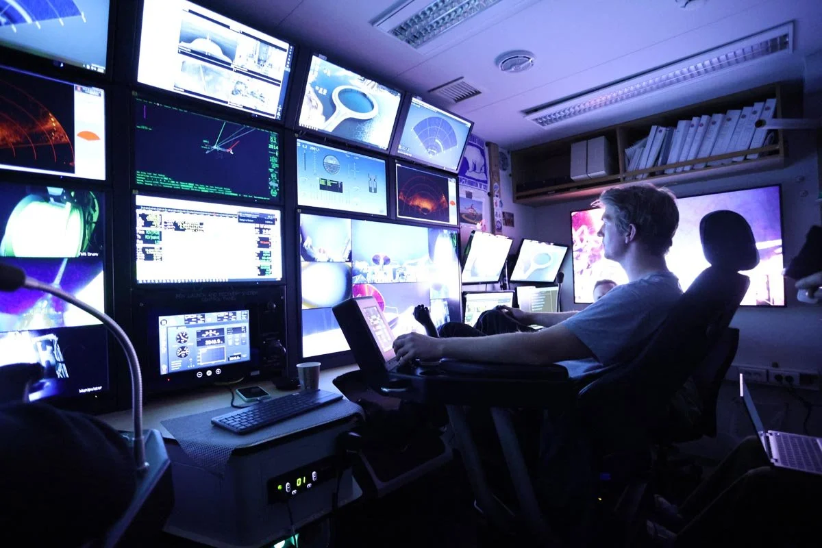 Stemningen var til å ta og føle på i ROV-kontrollrommet da undervannsfarkosten viste de aller første bildene av den lite kjente strukturen. Foran til bak: Carmen Gaina (UiO), Thomas Funck (GEUS) og Maja Jæger (UiB).