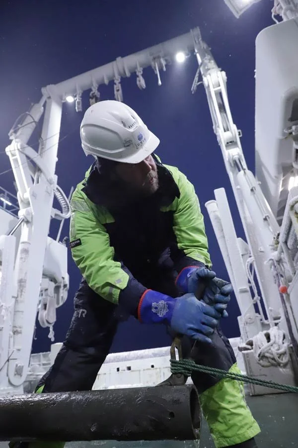 Kjerneprøvetakeren er kommet tilbake om bord og Max Weber (UiT) løsner plasthylsen som er inni for å ta ut prøven. Det ble forsøkt tatt prøver på to forskjellige steder med kjerneprøvetakeren. Det første var vellykket, men ikke den andre. Det hender at røret treffer stein på bunnen, og ikke klarer å synke ned i sedimentlaget. Dessverre finner ikke man ut av dette før utstyret har blitt heiset opp om bord igjen.