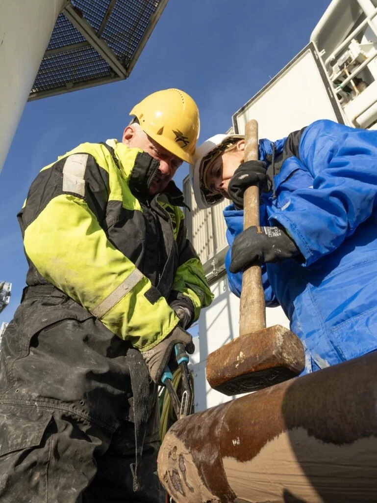 Prøven er på dekk, og Jasmin Schönenberger (NGU) hjelper Stig Monsen (UiB) med å få plastrøret som inneholder kjernen ut av prøvetakeren.